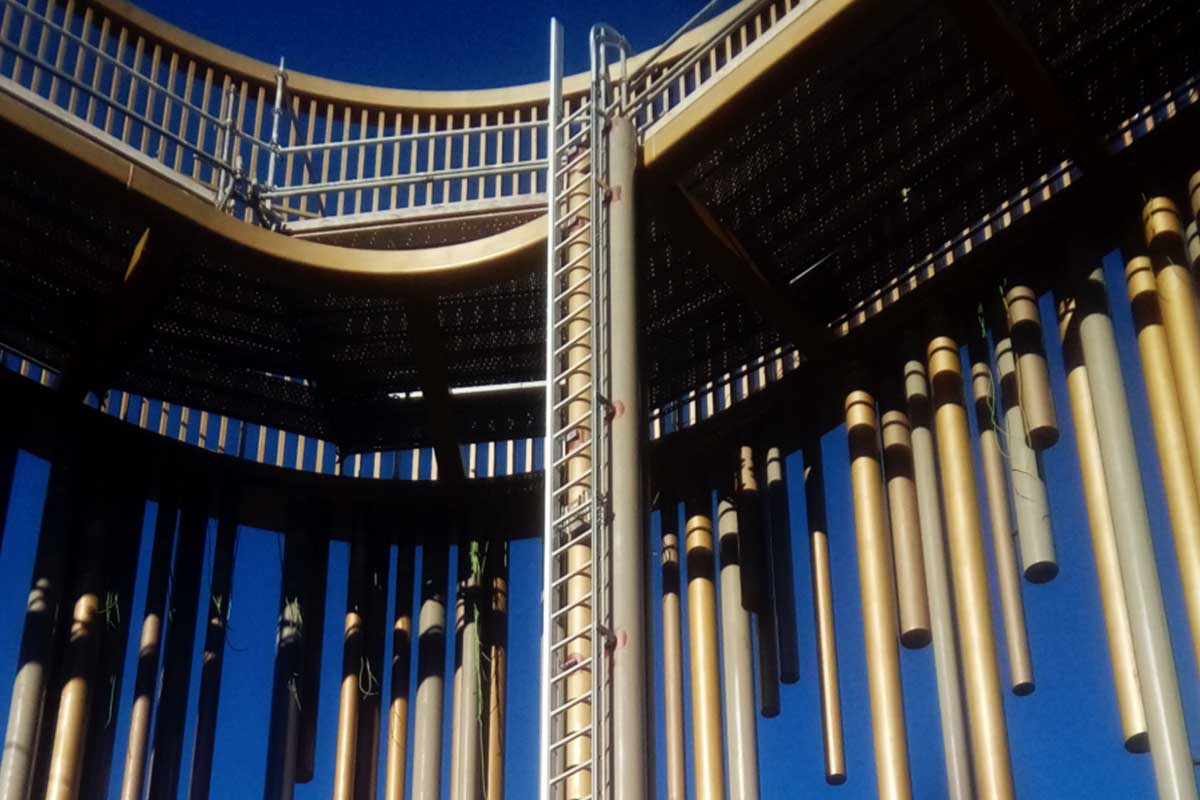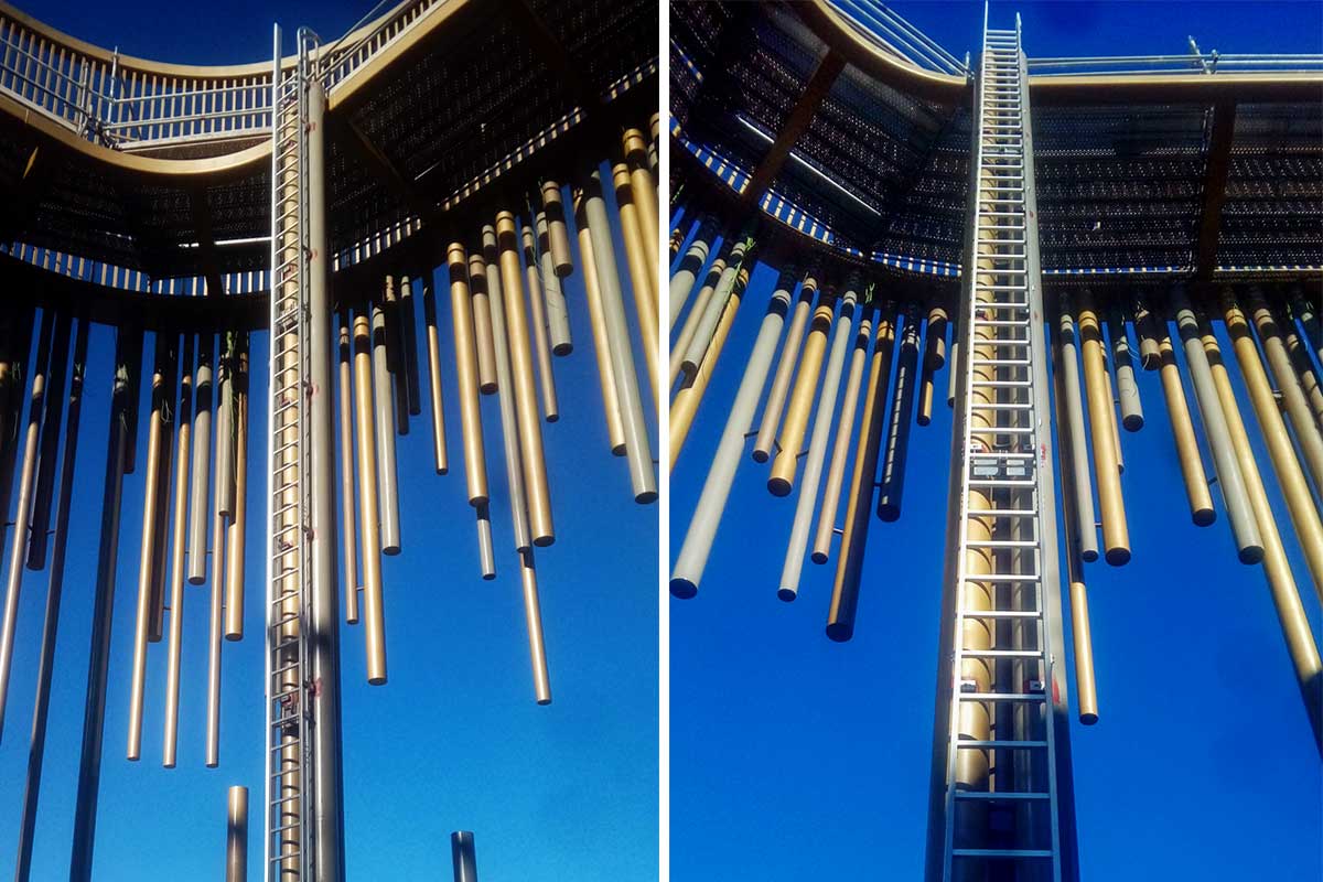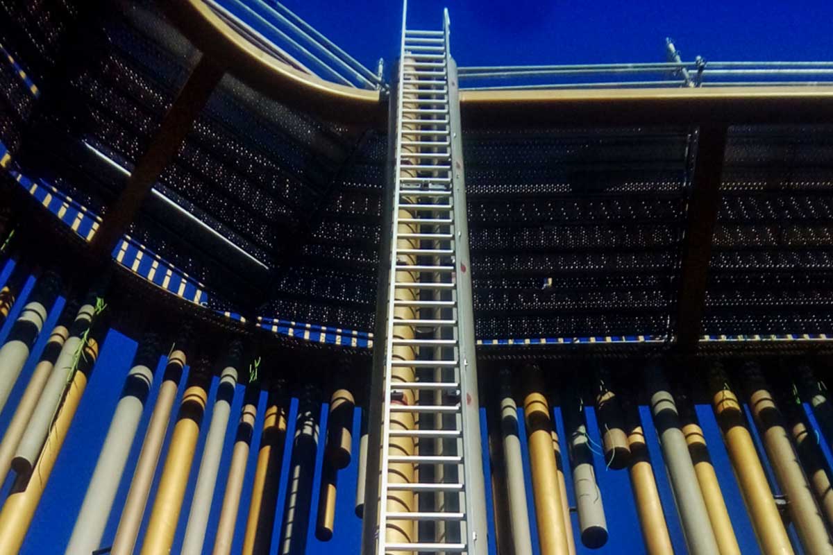 - Escalera de acceso vertical en aluminio anodizado con rail anticaídas incorporado conforme EN 353-1.