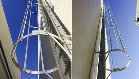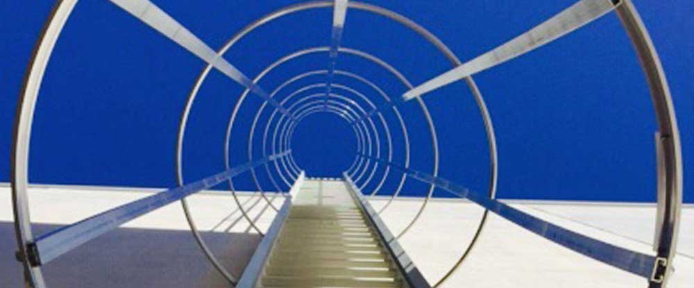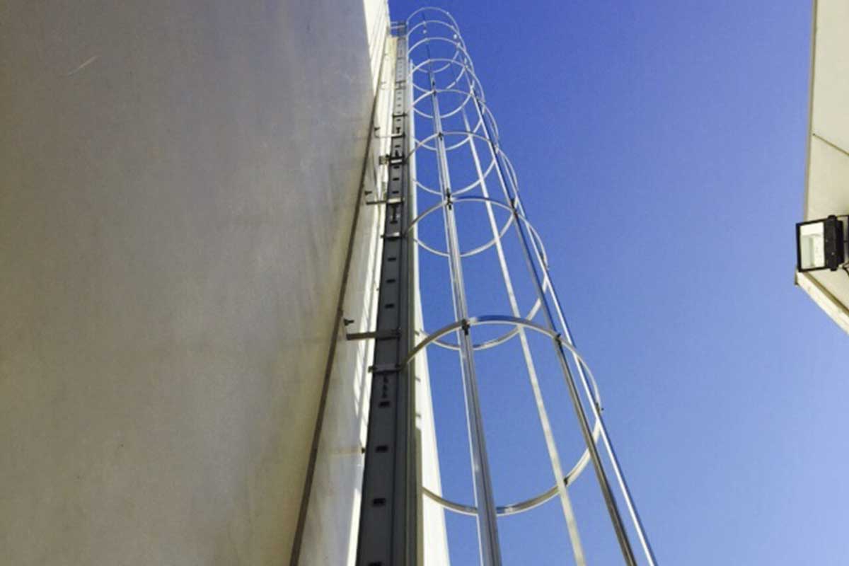 Instalación de escalera de acceso a cubierta en fábrica de productos químicos con un sistema de protección integrado en la misma y provisto de un alto nivel de seguridad para las personas que asciendan por la escalera.