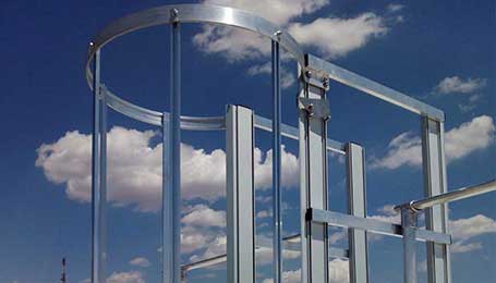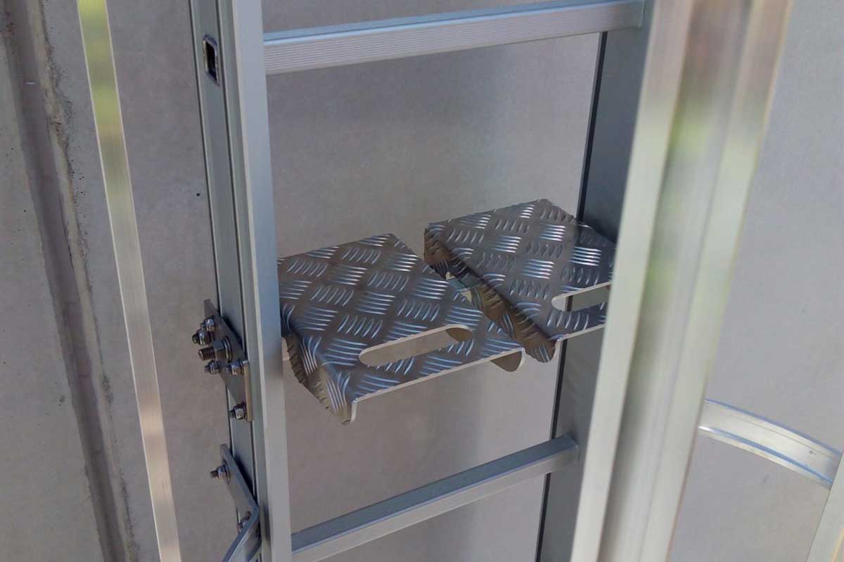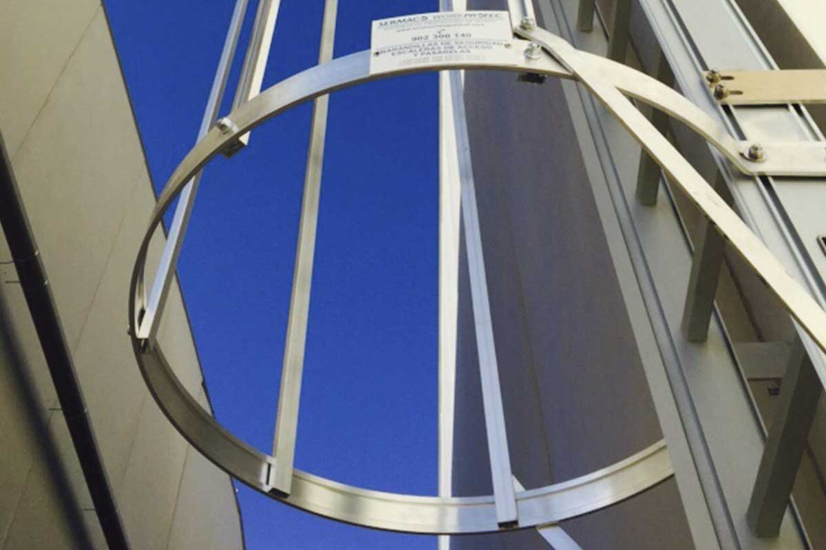 Esta escalera de acceso vertical está fabricada a medida con aluminio natural. Incorporan dispositivos de anclaje vertical, las denominadas líneas de vida, acoplados en montante o eje central de escalera. Dependiendo de la altura del sistema, incorporan también un descansillo, bien como plataforma dividiendo la escalera en varios tramos o acoplando sobre los peldaños unas pletinas retráctiles para apoyo de pies. Garantizando así el descanso del operario en su tránsito vertical.