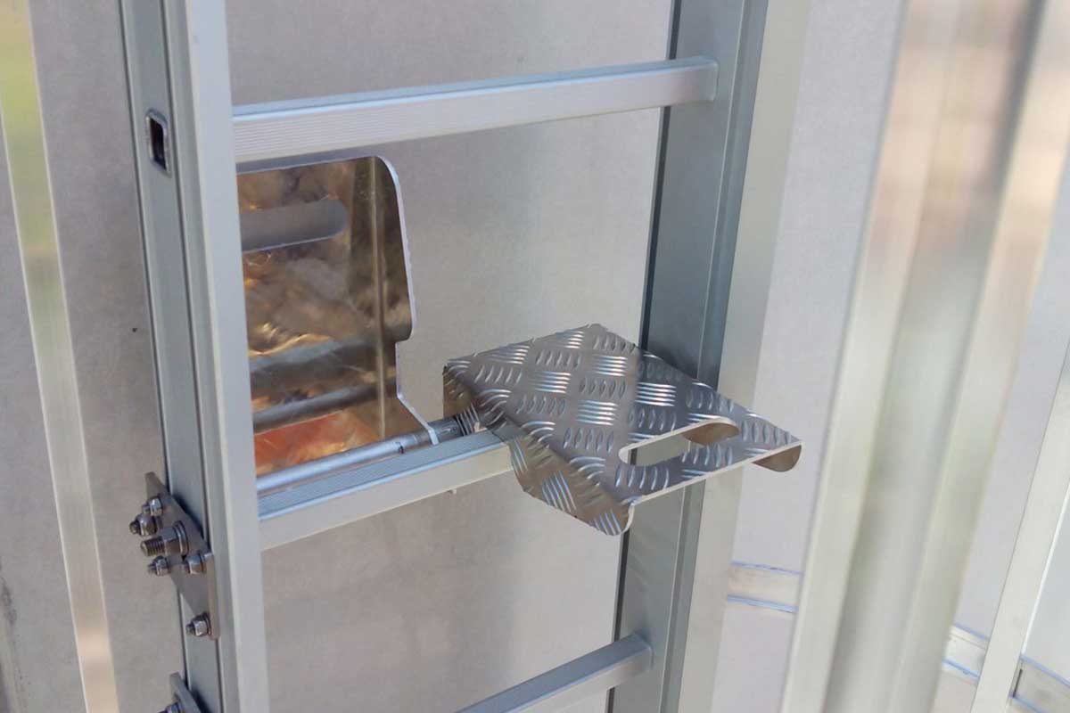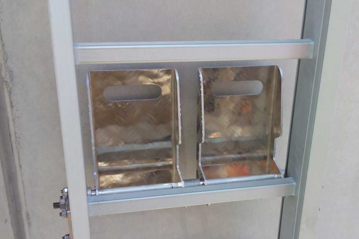 Como equipamiento adicional se ha instalado la protección dorsal exterior y plataforma sobre el parapeto de seguridad con barandilla en aluminio a ambos lados de la escalera.