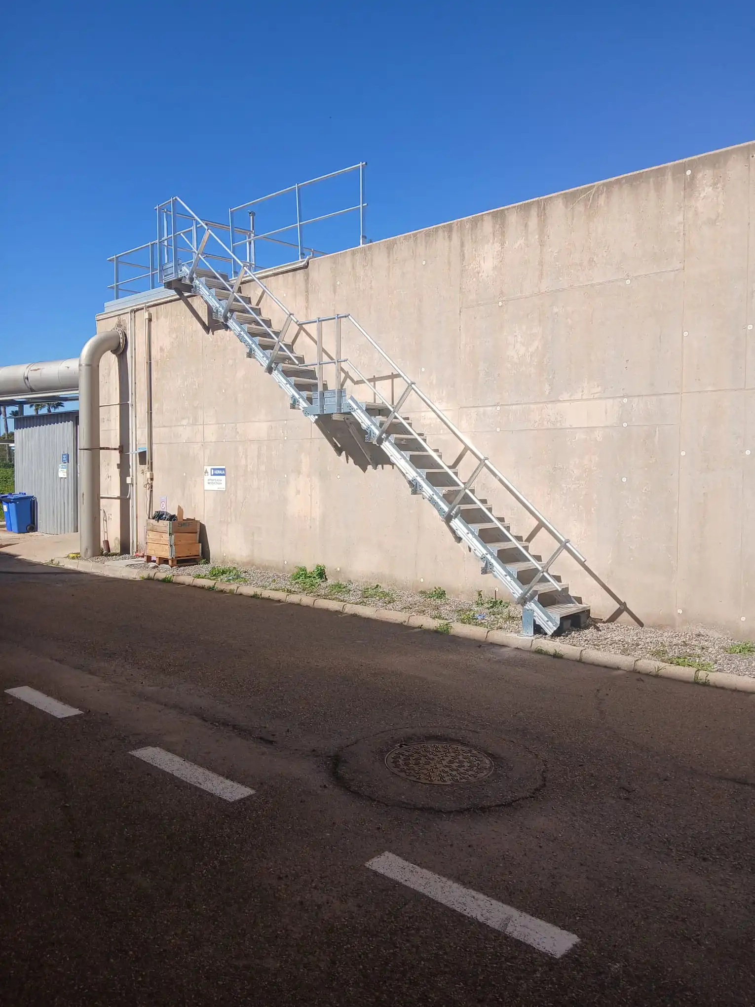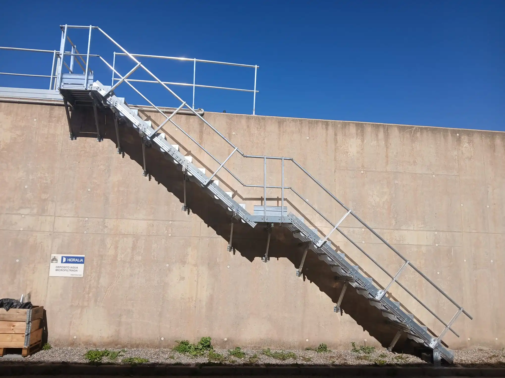 En instalaciones industriales y entornos técnicos, salvar un desnivel de 4,70 metros exige una solución de acceso estable, permanente y segura. En este proyecto ejecutado en Roquetas de Mar, se ha instalado una escalera fija industrial de peldaños equipada con: