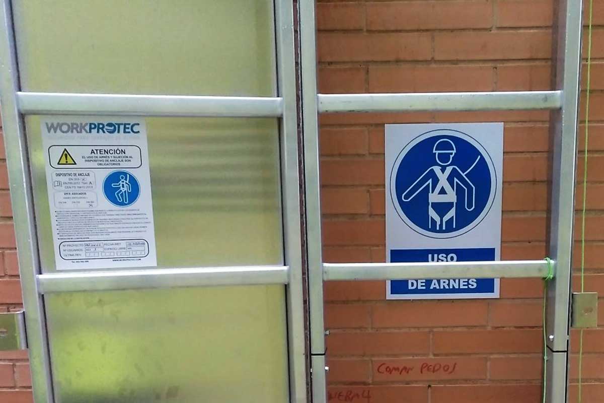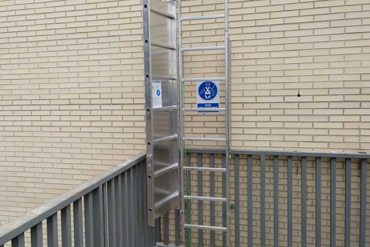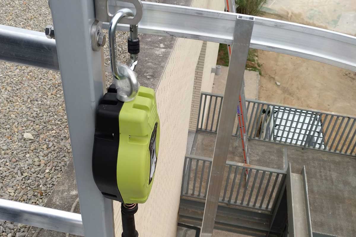 Como sistema de seguridad anticaídas instalado, hemos optado por instalar un punto de anclaje EN 795 Tipo A + barra extensible, con un dispositivo anticaídas retráctil conforme norma EN 360 para uso vertical y de la longitud adecuada a cada escalera. Dispone de un cordino llamador para poder bajar el extremo del retráctil para su utilización y posterior puesta en reposo al finalizar el descenso.