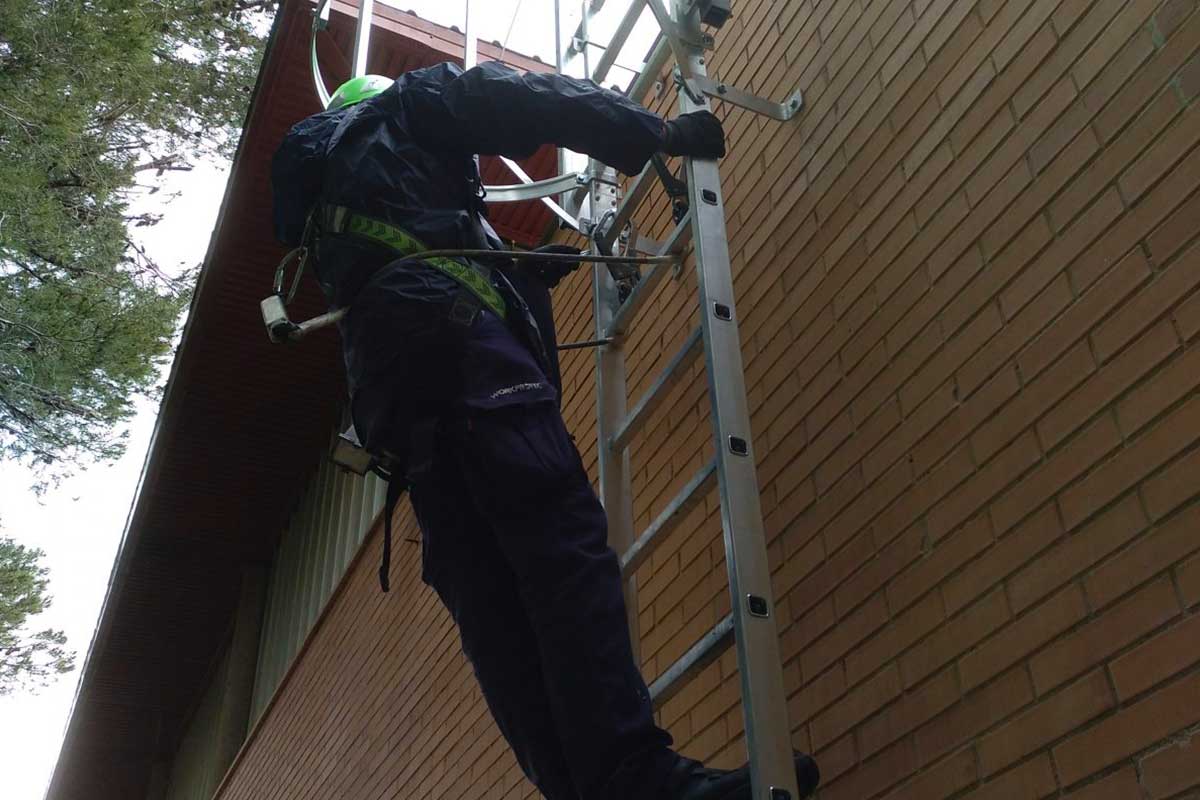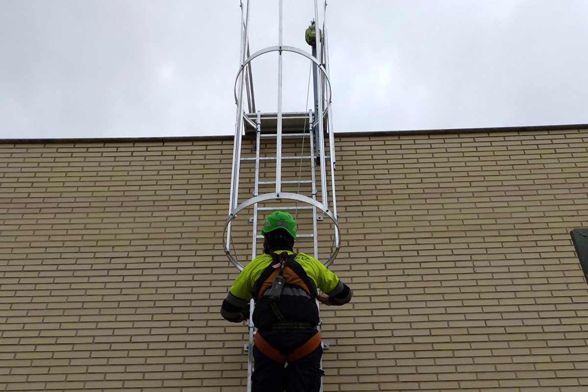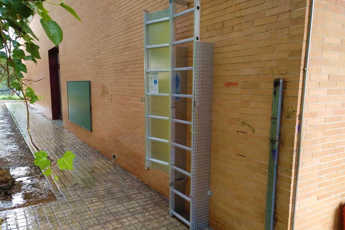 Instalación de escaleras verticales fijas a cubiertas en un colegio de niños para el mantenimiento y revisión de las instalaciones, sumideros, bajantes, etc.