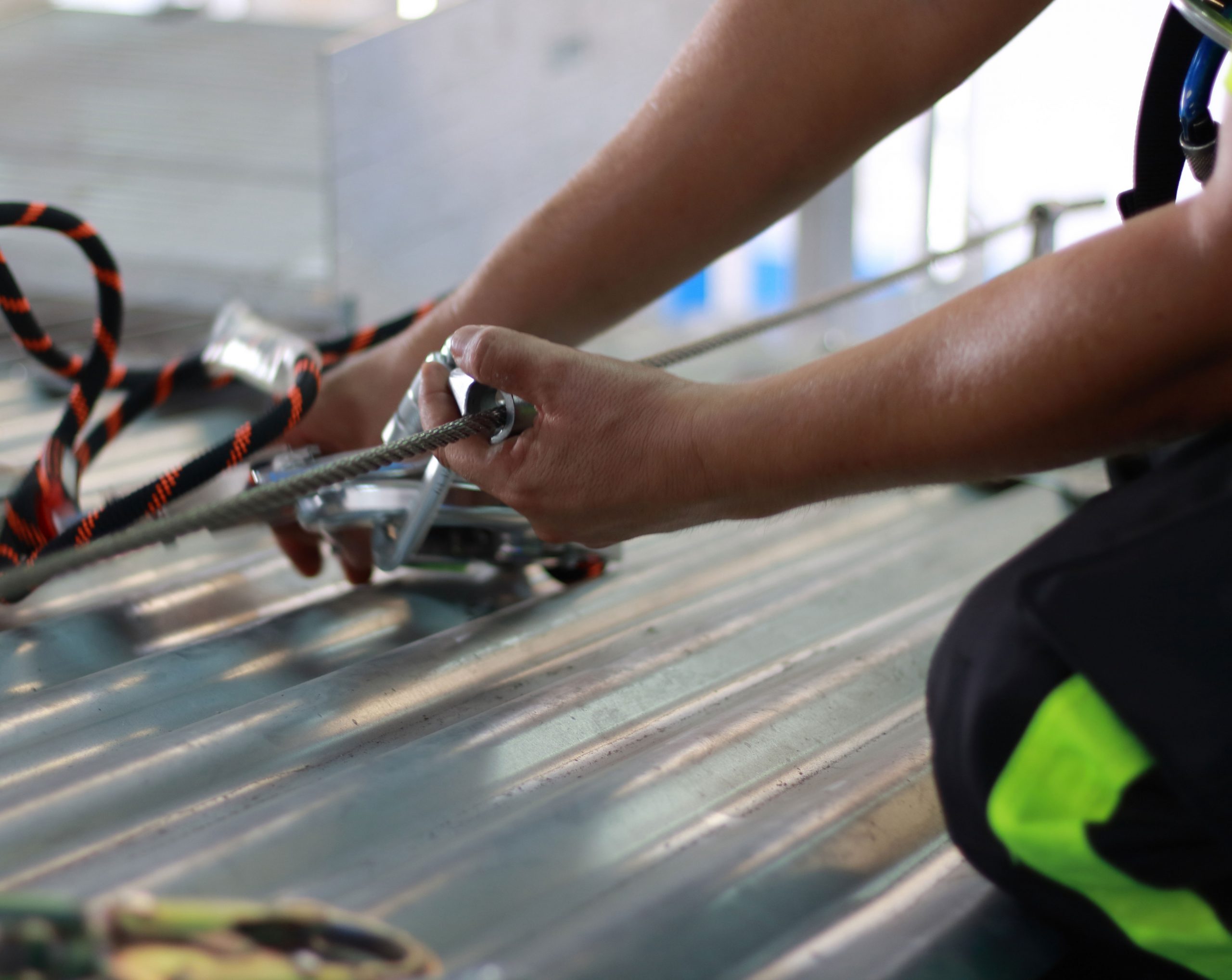 Se realizó el suministro, montaje y certificado de una línea de vida temporal textil fijada mediante peanas a la cubierta de chapa metálica mediante tornillería autorremachable M6 milímetros.