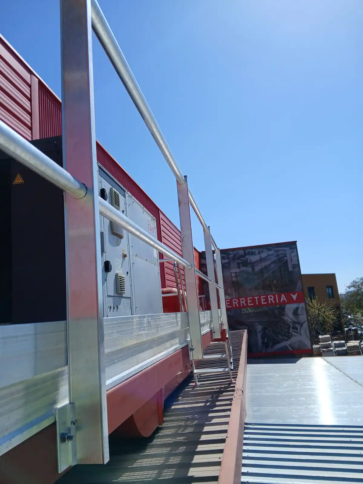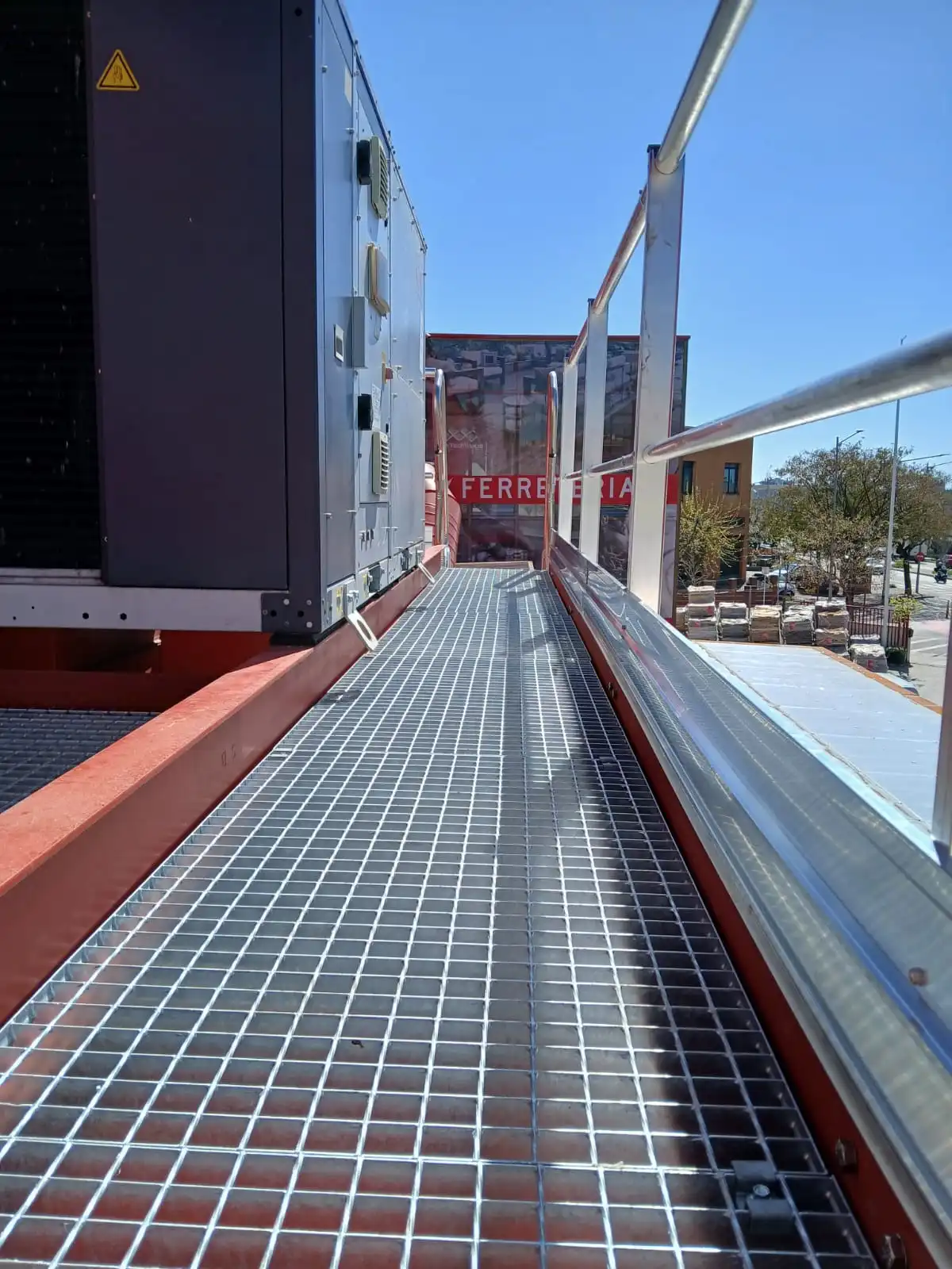 La actuación ha consistido en la creación de un sistema de tránsito seguro mediante una solución estructural adaptada a la cubierta existente, permitiendo un acceso cómodo, estable y seguro a los equipos de climatización.