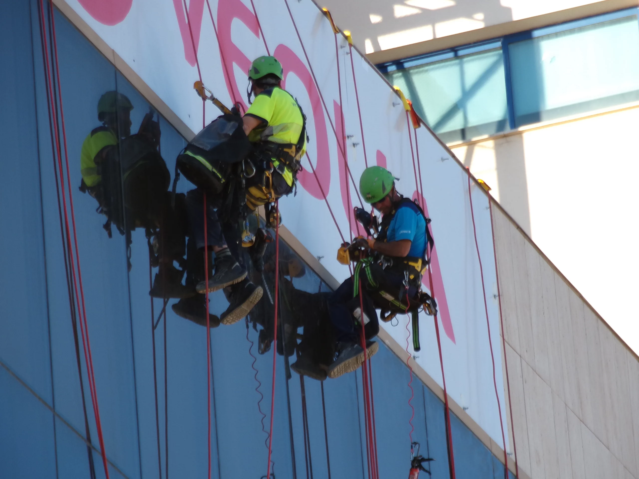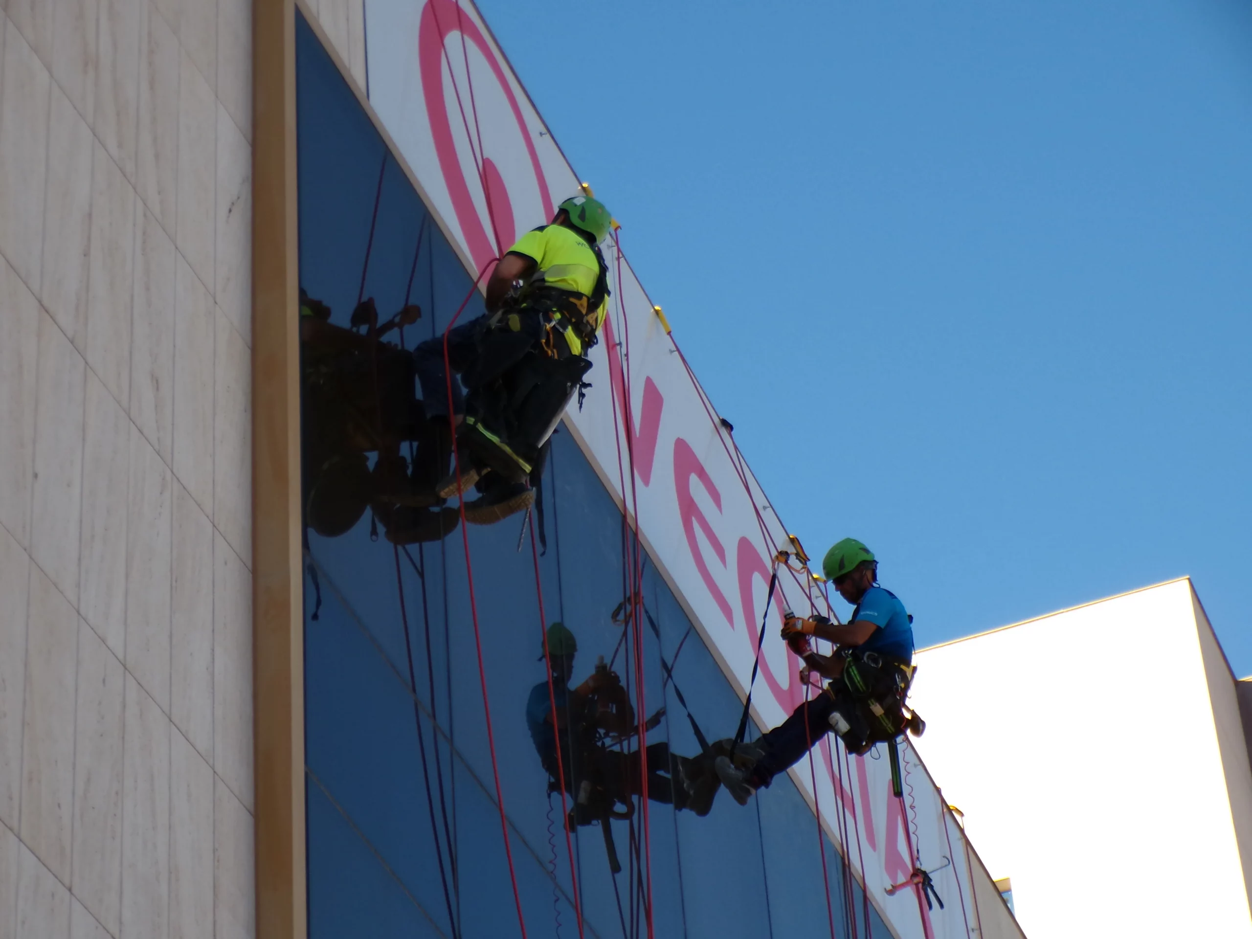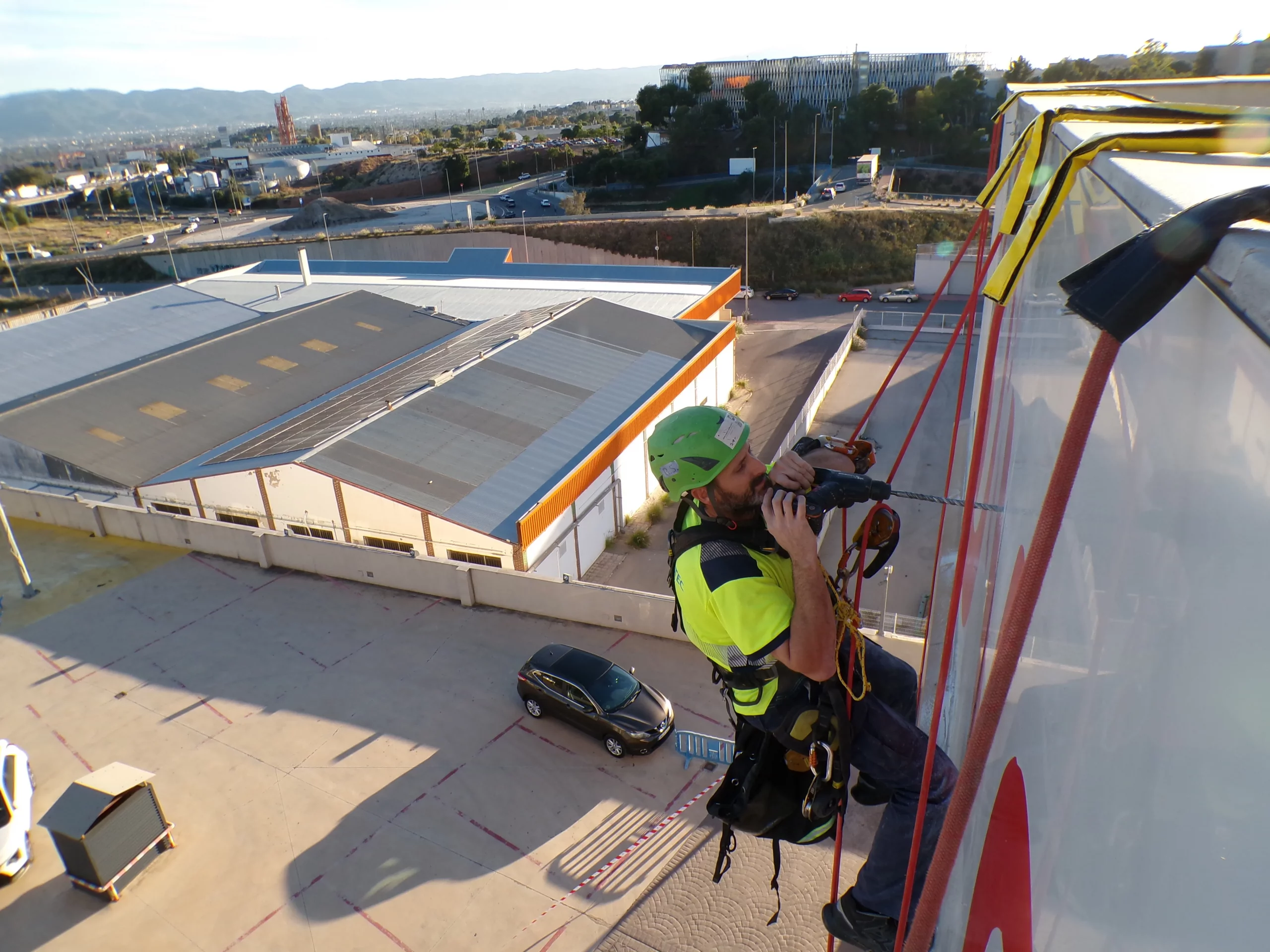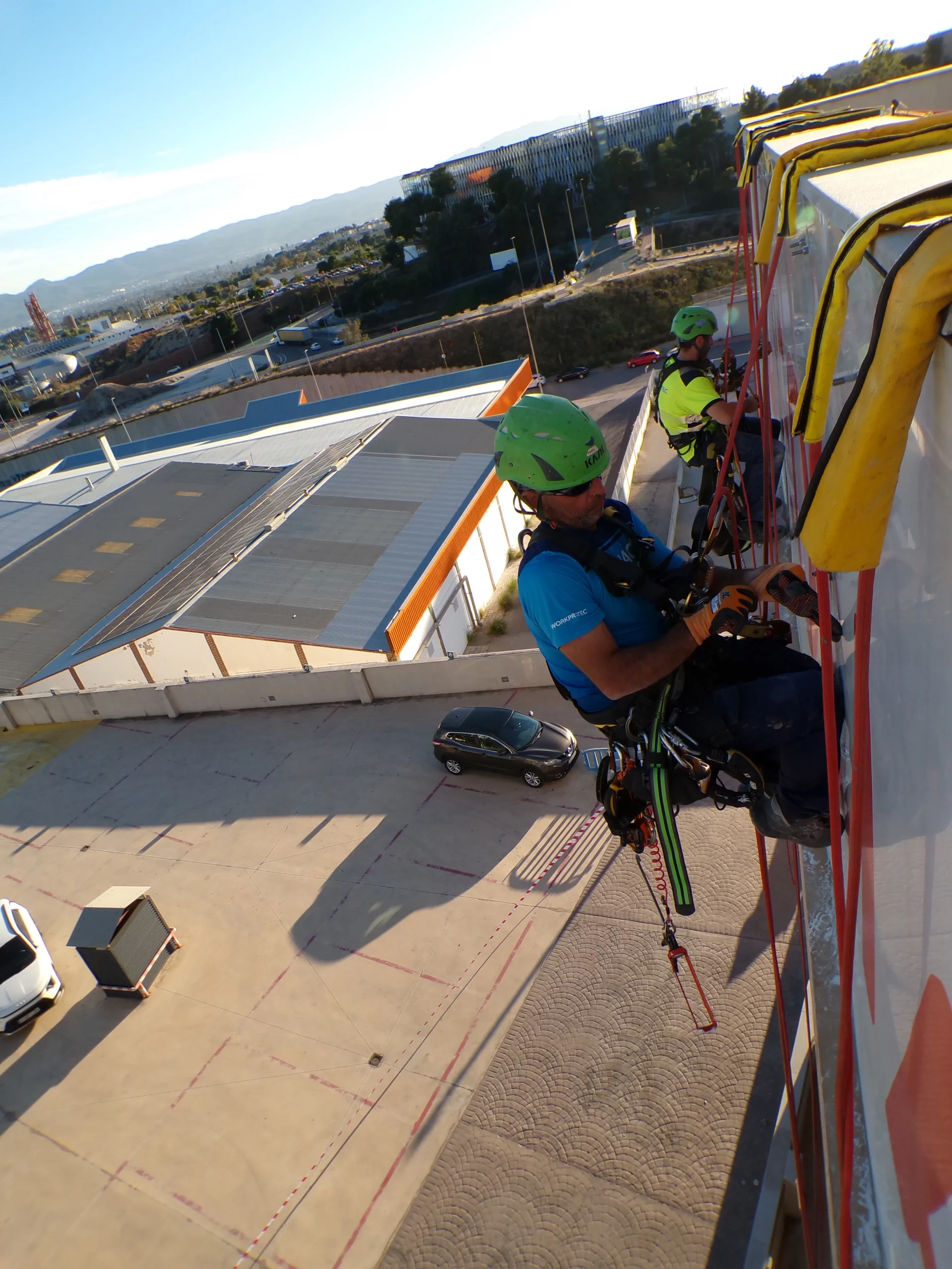Gracias a la instalación de los puntos de anclaje, nuestros técnicos especializados en trabajos verticales pudieron realizar el descuelgue controlado y proceder a la colocación del cartel corporativo en fachada de forma rápida, limpia y segura.