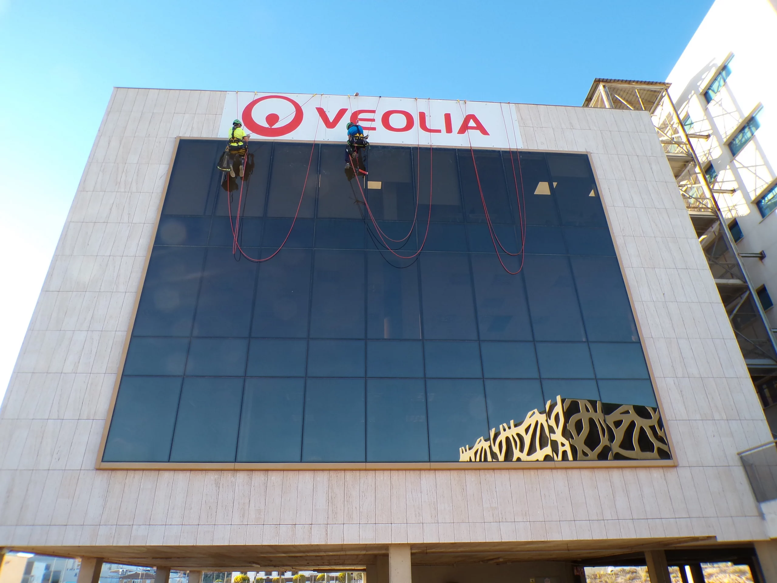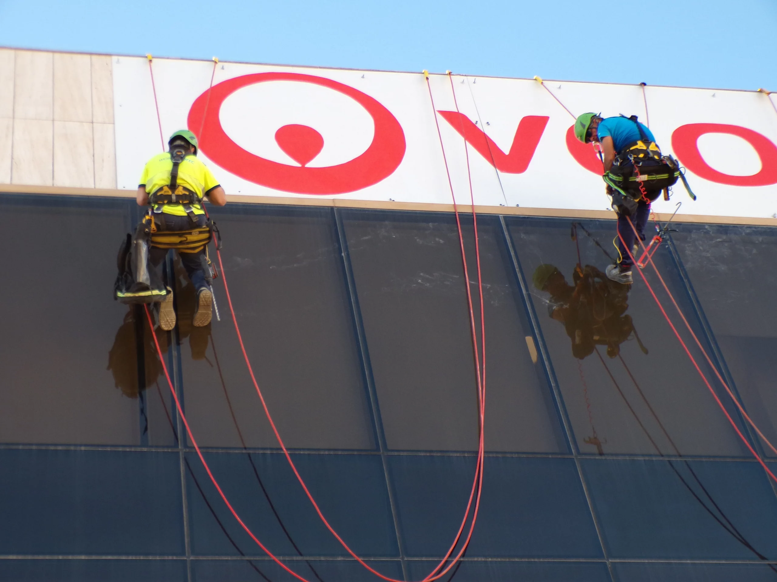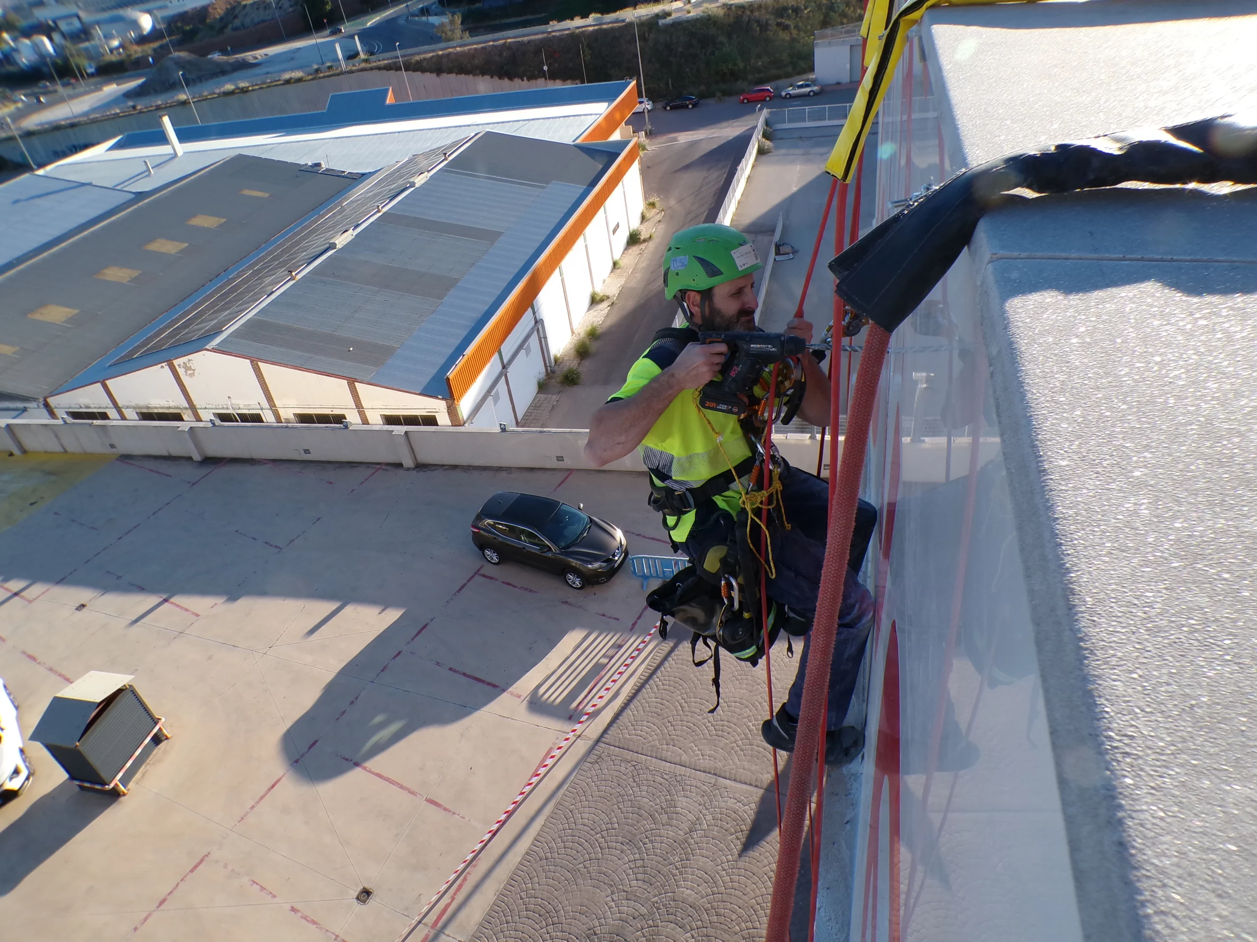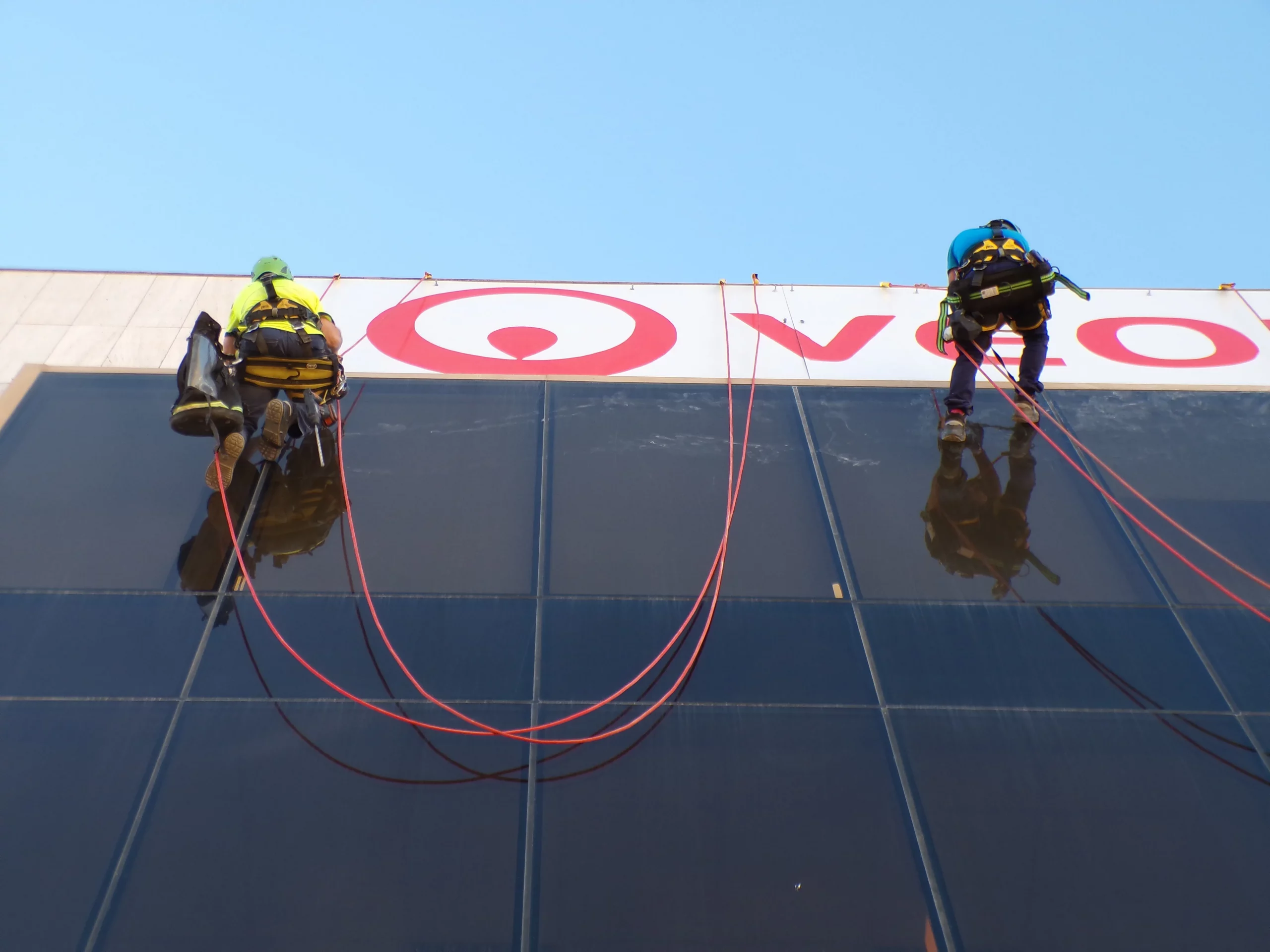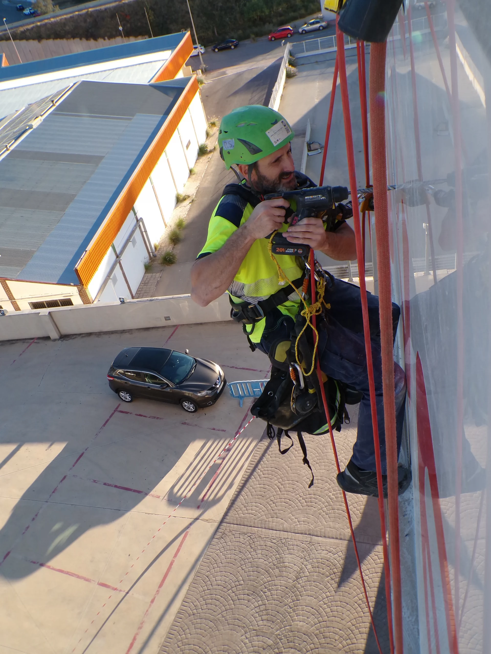 Gracias a la instalación de los puntos de anclaje, nuestros técnicos especializados en trabajos verticales pudieron realizar el descuelgue controlado y proceder a la colocación del cartel corporativo en fachada de forma rápida, limpia y segura.